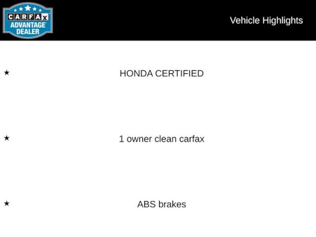 HONDA CERTIFIED, 1 owner clean carfax, ABS brakes.