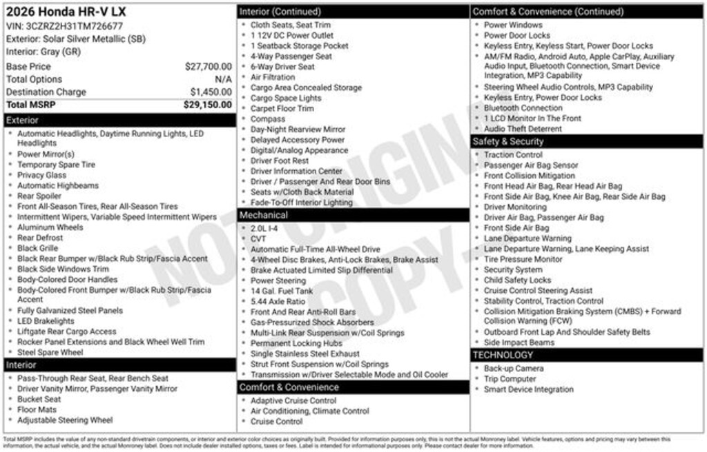 2026 Honda HR-V LX Gray 2.0L I4 DOHC 16V i-VTEC AWD CVT