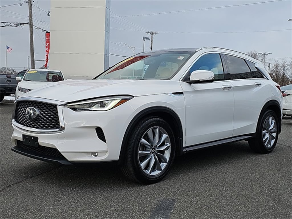 Recent Arrival! Lunar White 2022 INFINITI QX50 LUXE I4 CVT AWD CARFAX One-Owner. Clean CARFAX. QX50 LUXE, 4D Sport Utility, I4, CVT, AWD, Lunar White, Wheat Leather, 4-Wheel Disc Brakes, 5.846 Axle Ratio, 6 Speakers, ABS brakes, Air Conditioning, Alloy wheels, AM/FM radio: SiriusXM, Anti-whiplash front head restraints, Auto High-beam Headlights, Auto-dimming Rear-View mirror, Automatic temperature control, Backup Camera, Black Splash Guards (Set of 4), Brake assist, Bumpers: body-color, Cargo Package, CD player, Delay-off headlights, Driver door bin, Driver vanity mirror, Dual front impact airbags, Dual front side impact airbags, Electronic Stability Control, Emergency communication system: INFINITI InTouch, Exterior Parking Camera Rear, Floor Mats, Four wheel independent suspension, Front anti-roll bar, Front Bucket Seats, Front Center Armrest, Front dual zone A/C, Front fog lights, Front reading lights, Fully automatic headlights, Garage door transmitter: HomeLink, Heated door mirrors, Heated Front Bucket Seats, Heated front seats, Illuminated entry, Illuminated Kick Plates, Knee airbag, Leather Shift Knob, Leather-Appointed Seat Trim, Low tire pressure warning, Occupant sensing airbag, Outside temperature display, Overhead airbag, Overhead console, Panic alarm, Passenger door bin, Passenger vanity mirror, Power door mirrors, Power driver seat, Power Liftgate, Power moonroof, Power passenger seat, Power steering, Power windows, Radio data system, Radio: HD Audio System, Rear anti-roll bar, Rear reading lights, Rear seat center armrest, Rear side impact airbag, Rear window defroster, Rear window wiper, Remote keyless entry, Security system, Speed control, Speed-sensing steering, Speed-Sensitive Wipers, Split folding rear seat, Spoiler, Steering wheel mounted audio controls, Tachometer, Telescoping steering wheel, Tilt steering wheel, Traction control, Trip computer, Turn signal indicator mirrors, Variably intermittent wipers, Wheels: 19" Silver Painted Aluminum Alloy.